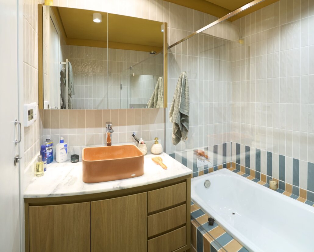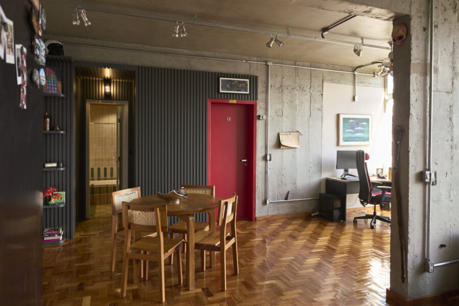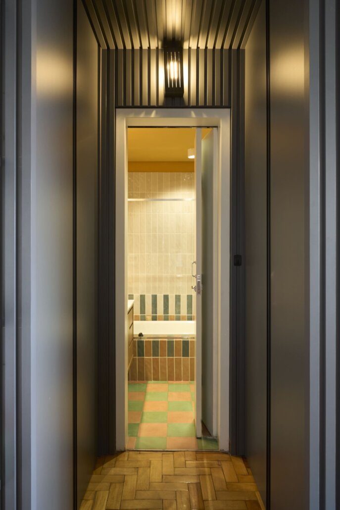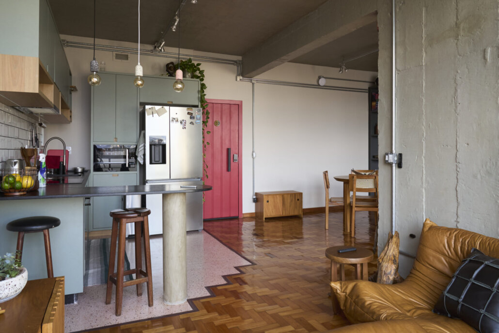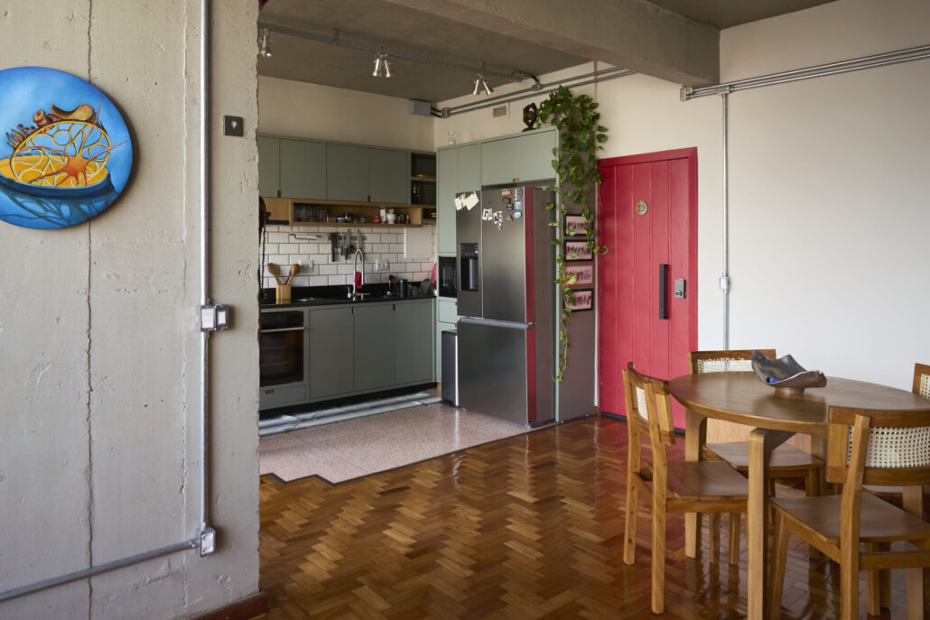 Elementos com acabamento em madeira e obras de arte equilibram o conjunto, resultando em um ambiente que não apenas tem funcionalidade, mas também acolhe. O banheiro, por exemplo, assume um caráter disruptivo, colorido e contemporâneo, mostrando que inovação e respeito ao patrimônio podem coexistir.