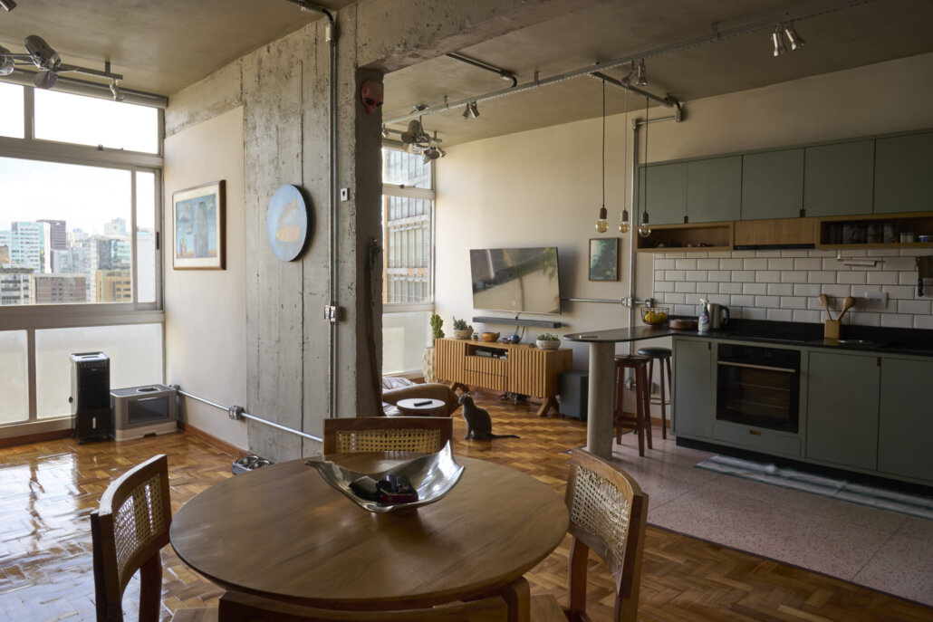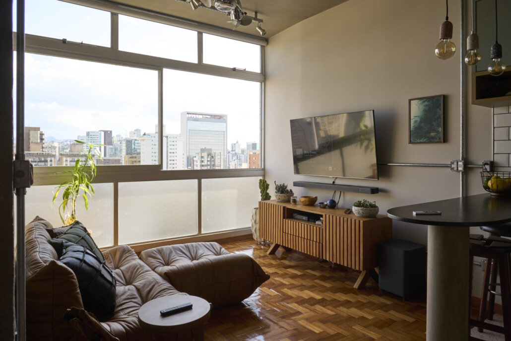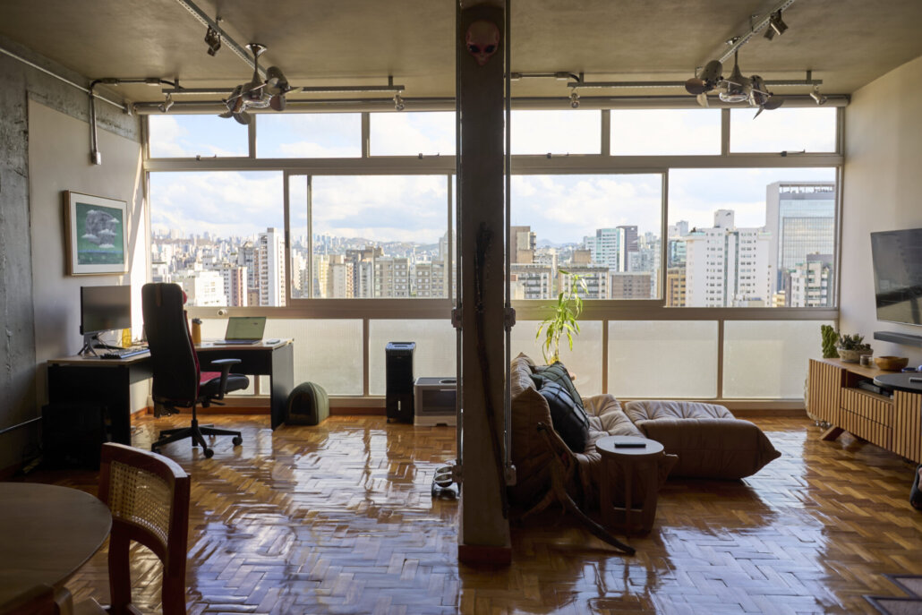 Ao abrir o apartamento para a fachada e eliminar barreiras desnecessárias, o espaço passa a dialogar de forma mais direta com a cidade, reforçando a relação entre interior, paisagem urbana e qualidade ambiental.