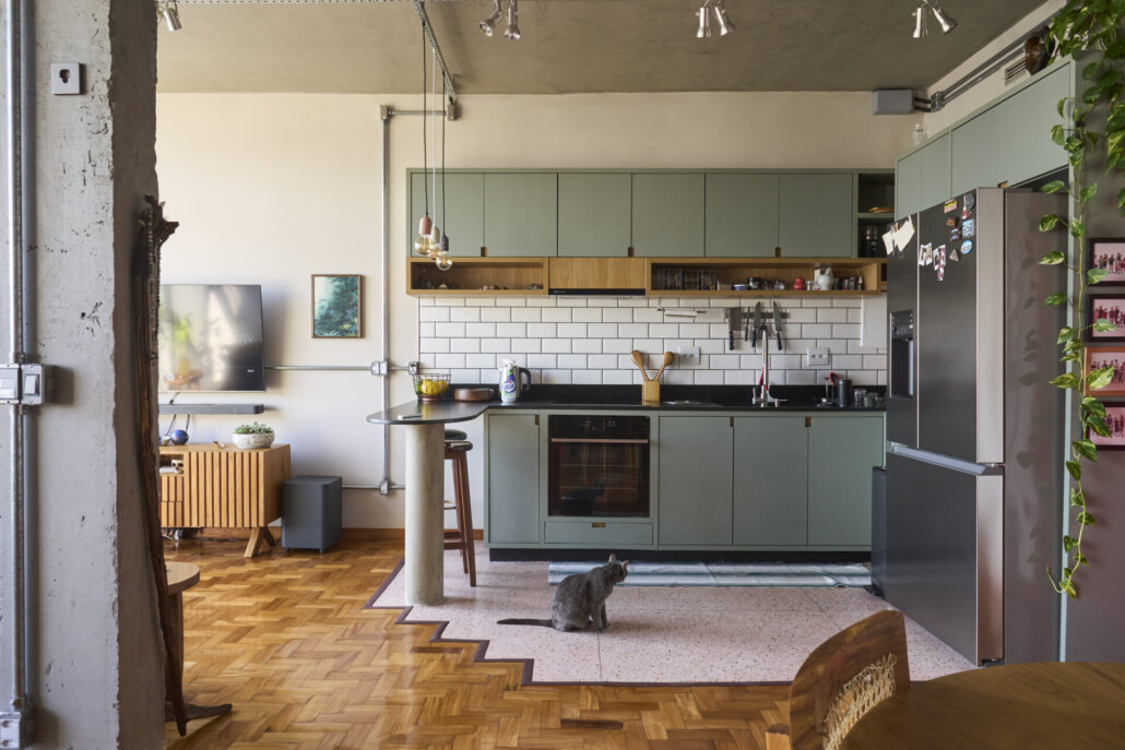 A escolha dos materiais segue uma lógica de equilíbrio. Seleção de técnicas produtivas mais artesanais, como o ladrilho hidráulico e o granilite, dialogam com os traços industriais do concreto e estrutura elétrica aparente, criando uma arquitetura que combina memória e contemporaneidade.